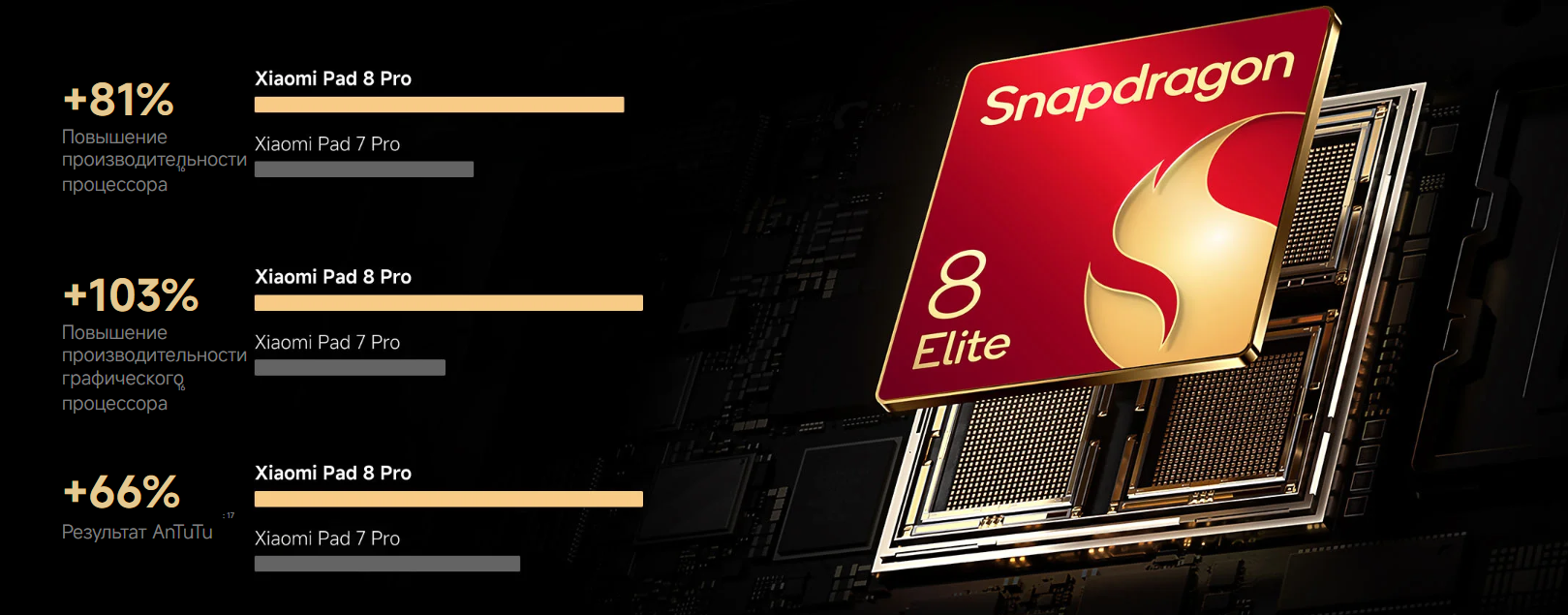 В основе Xiaomi Pad 8 Pro лежит процессор Qualcomm Snapdragon 8 Elite с восемью ядрами и частотой до 4200 МГц. В сочетании с 8 ГБ оперативной памяти планшет обеспечивает высокий уровень скорости в повседневных задачах, многозадачности, работе с тяжелыми приложениями и мультимедийном контенте. Модель подойдет тем, кто хочет получить мощное устройство с запасом производительности на будущее.