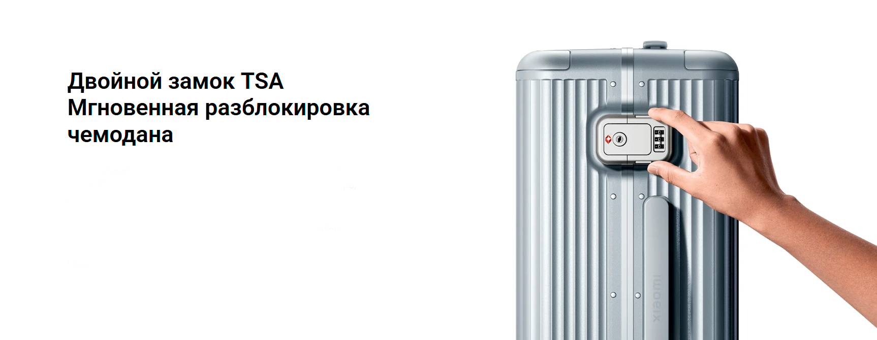 Чемодан оснащен замком TSA для безопасных перелетов, имеет защиту от влаги и ударопрочный корпус. Дополнительно реализована антимикробная защита, что особенно актуально в поездках.