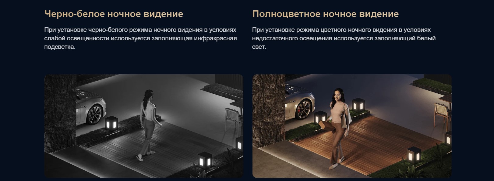 Мощный инфракрасный + полноцветный светодиод добавили поддержку для более яркого света и большей освещенной области. Определяет уровень окружающего освещения и подстраивается под него. Четкое ночное видение в пределах 10 метров, так что посетители или воры могут быть идентифицированы с первого взгляда.