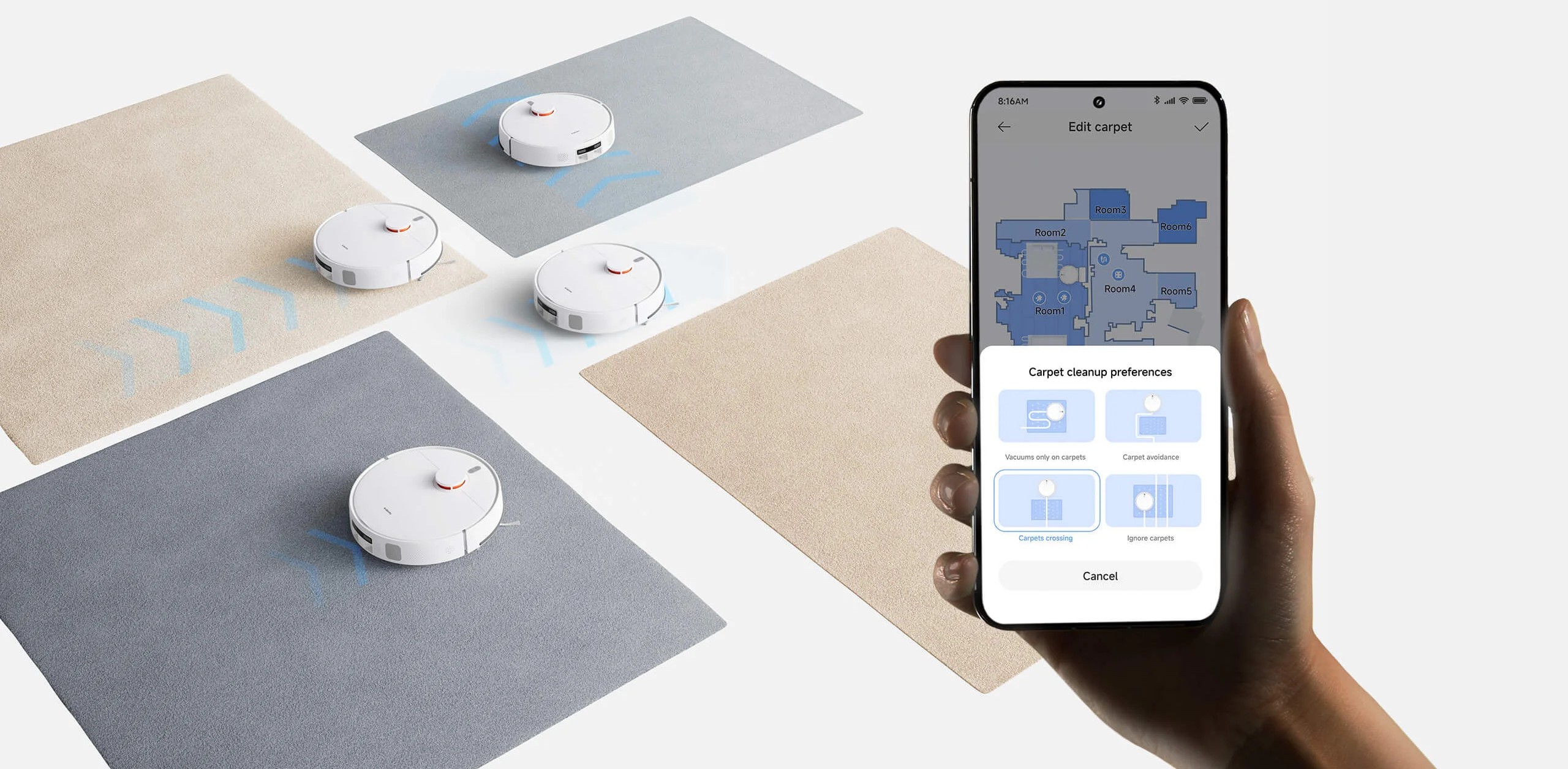 Лазерный сканер быстро создаёт карту помещения с точным зонированием. В приложении Xiaomi Home доступна 3D-визуализация, сохранение карт нескольких этажей и настройка виртуальных стен, зон уборки или запрета.